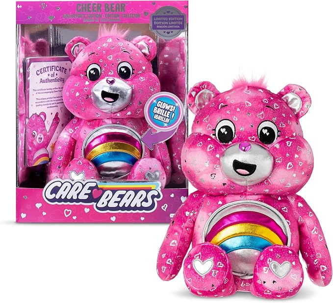 - COLLECTOR EDITION PLUSHIE: The 35cm Care Bears Collector Edition Cheer Bear is every collector’s dream! With a unique look, light-up belly badge, and beautiful silver accents, this bear is a must-have for any Care Bears collection.
