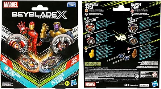 - HARNESS THE POWER: Includes 2 Takara Tomy-designed Beyblade X tops with authentic die-cast metal parts: Iron Man 4-80B Right-Spin Stamina Type and Thanos 4-60B Right-Spin Balance Type; and 2 launchers