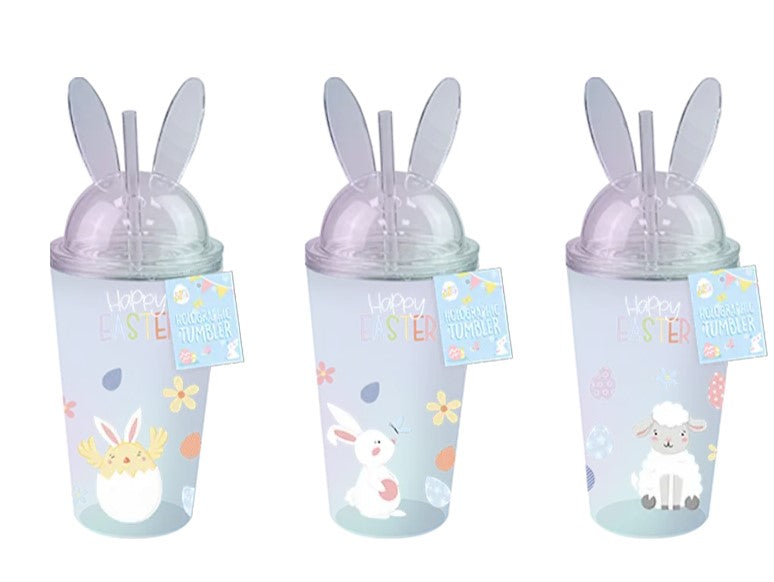 Each double walled tumbler has a translucent plastic construction with holographic reflective colour on the inside walls and cute easter animal themed design reading 'Happy Easter'. The lid is fitted with a straw and has clear plastic bunny ears. Silicone ring inside lid to keep drinks secure and prevent spills.