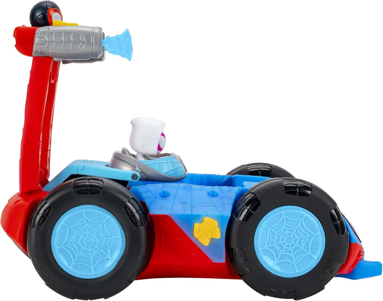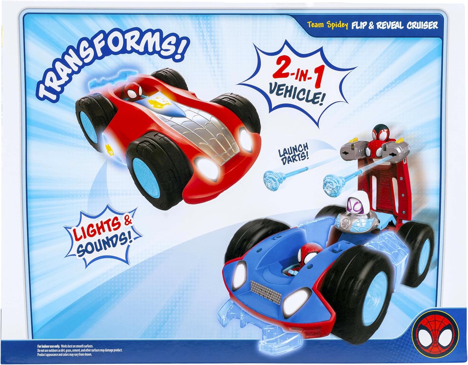 - FLIPPING VEHICLE: 11-inch vehicle flips to reveal Team Spidey with lights and sounds.