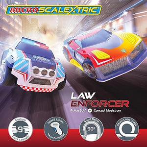 - Law Enforcer Electric Car Track Builder: Take control of the pursuit with the Scalextric Law Enforcer Mains Powered Slot Cars Set! Feel the intensity as the powerful police SUV chases down a sleek, futuristic fantasy car. Who will dominate in this high-stakes race? Will strategy and speed be enough to evade capture, or will the law prevail? Get ready to put the pedal to the metal and decide the outcome in this electrifying battle of wits and wheels