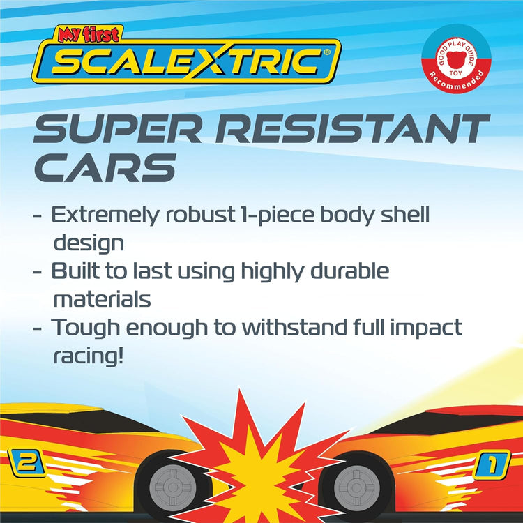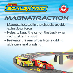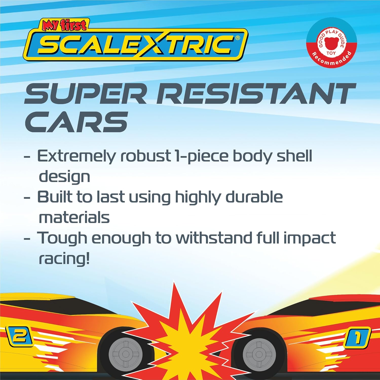 - Super Resistant Kids Toys: The My First Scalextric set micro scale race car features an extremely robust 1-piece body shell design, tough enough to withstand full impact toy car track racing. Magnatraction helps to keep the car on the track with mains powered electrics, even when racing at high speeds, and prevents skidding for maximum enjoyment and play time