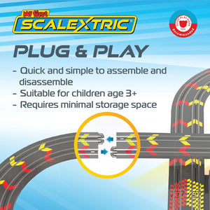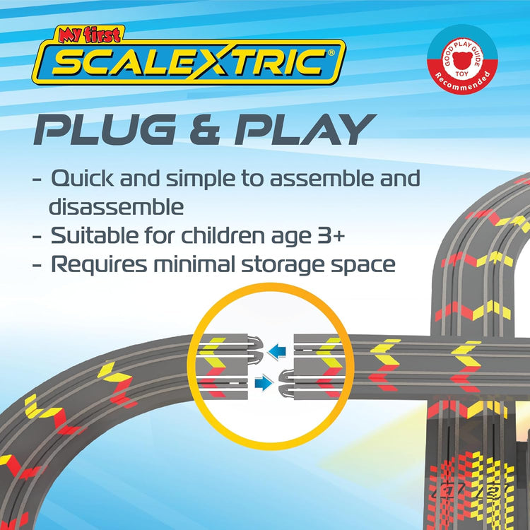 - Plug and Play Electric Car Track Toy: Our race car tracks for boys and girls feature Plug & Play technology making them quick and simple to assemble & disassemble. This slot car race tracks set requires minimal storage space and when set up covers an area of 61x108cm giving a track length of 256cm. The My First Scalextric track is suitable for children aged 3+