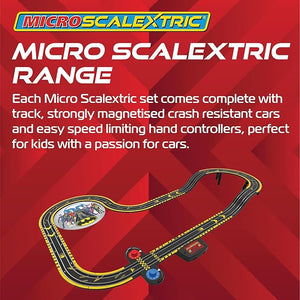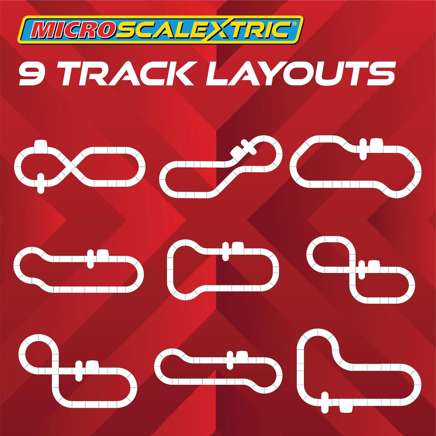 - Easy Kids' Play Vehicles: The Micro Scalextric Range features Plug & Play technology making it quick and simple to assemble & disassemble, the ideal race tracks for boys and girls. These small cars Scalextric sets requires minimal storage space and when set up covers an area of 91 x 131 cm giving a track length of 350 cm