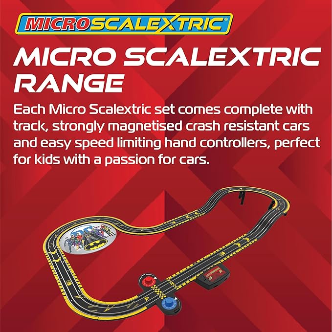 - Batman vs The Riddler Car Track Builder: Jump into the driver's seat for an epic duel with the Batman vs The Riddler Battery Powered Slot Cars Race Set. Gotham City's fate is in your hands as the Caped Crusader faces off against the Prince of Puzzles in this action-packed Micro Scalextric set. Will Batman's swift vehicle outpace The Riddler's enigmatic ride? Power up, lay down the track, and prepare for a confrontation that will determine the true protector of Gotham