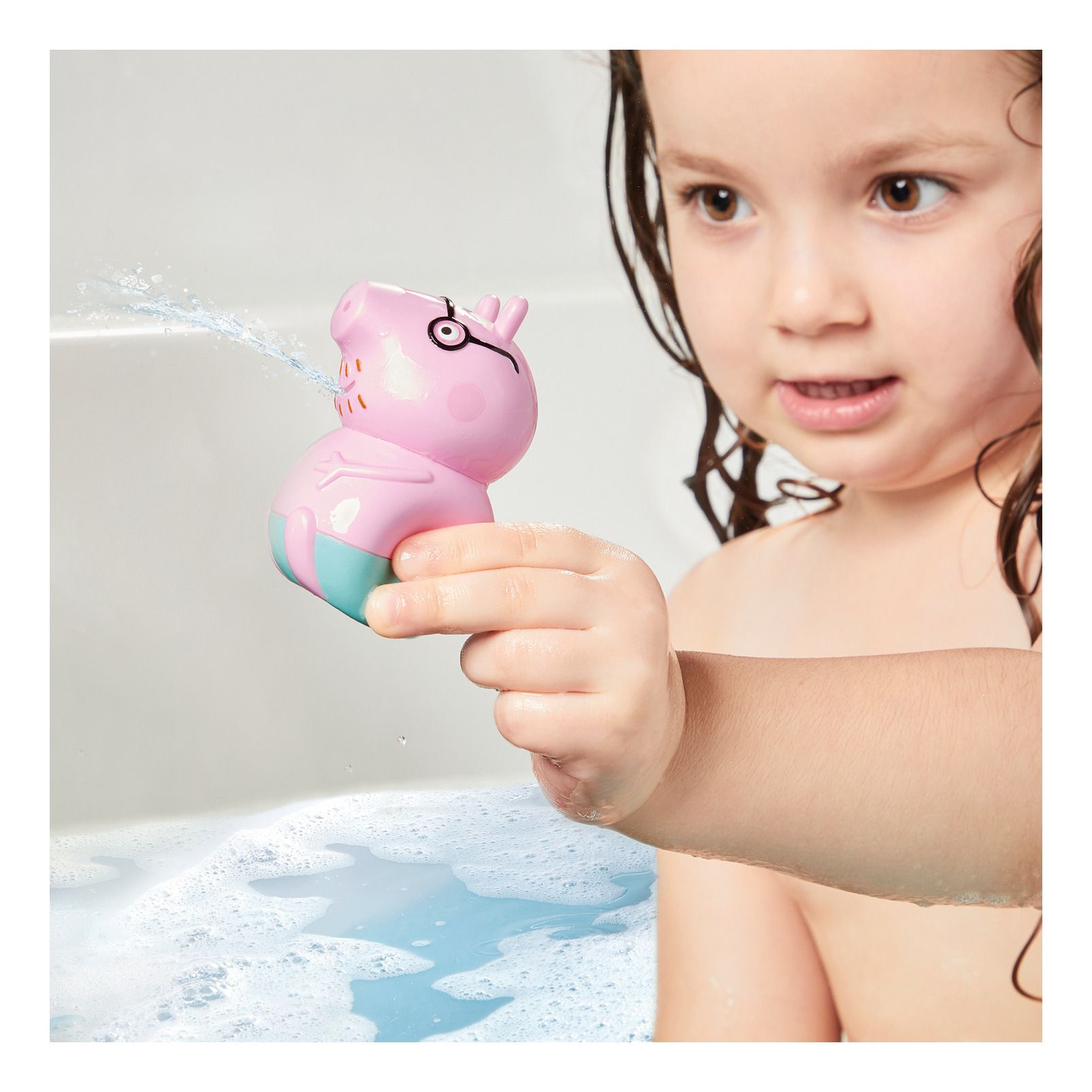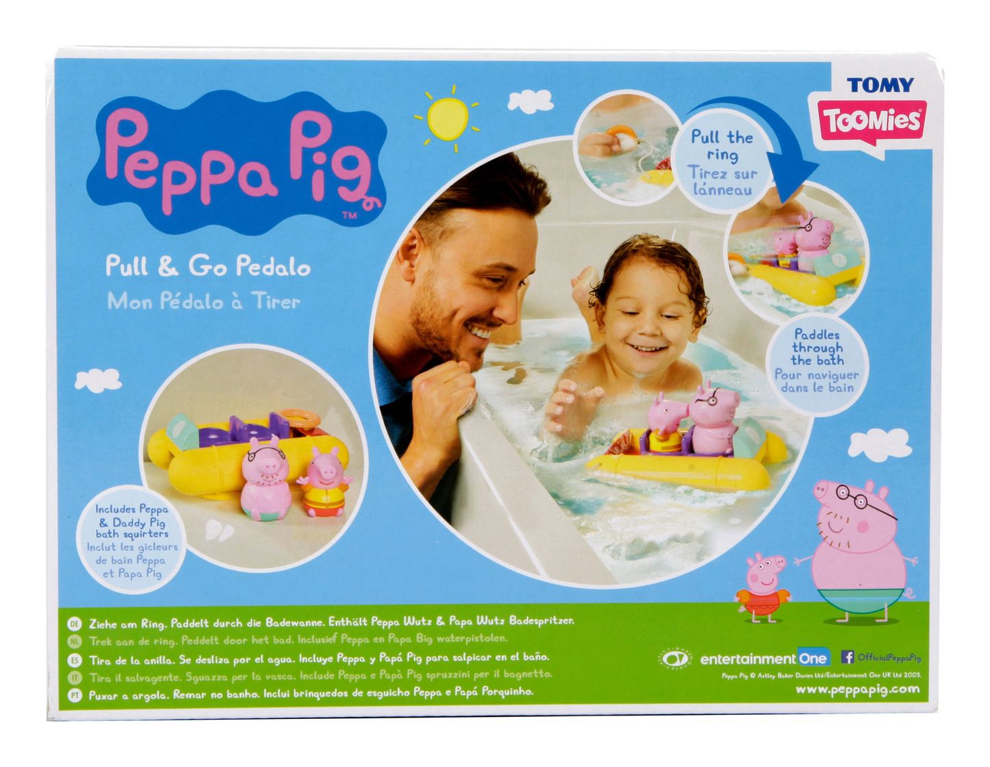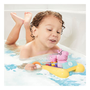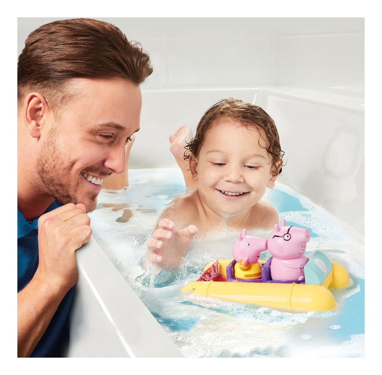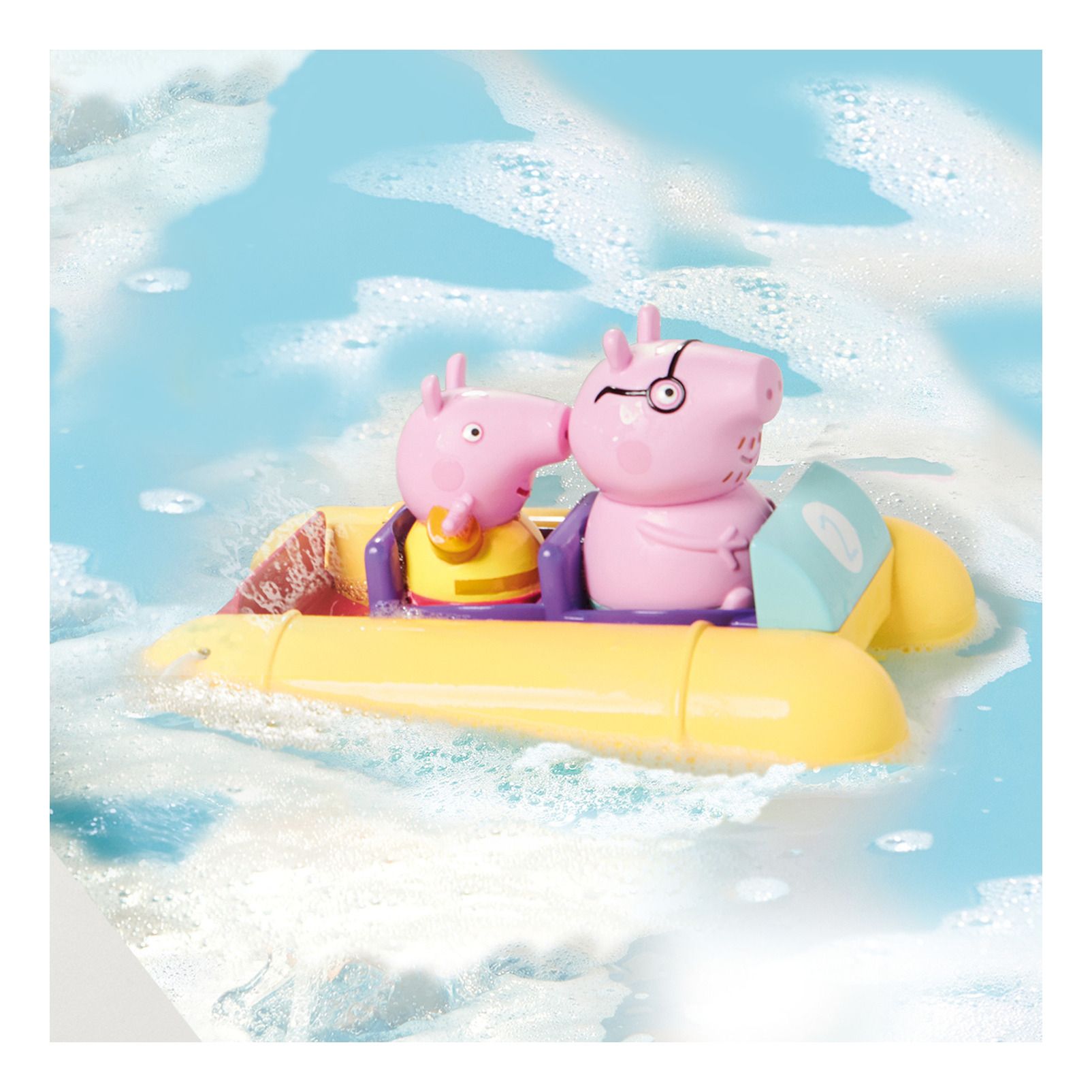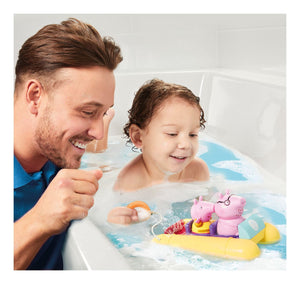 • Climb in, it’s bath time: Join Peppa Pig and Daddy Pig in the tub as they ride their bright yellow pedalo.