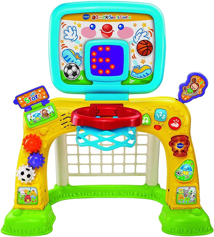 - 3-IN-1 SPORTS CENTRE: This fun and colourful baby toy has loads of features to keep children entertained and happy. Shoot a basket, score a goal or hit the target Explore more features including turning gears and sliding trophy