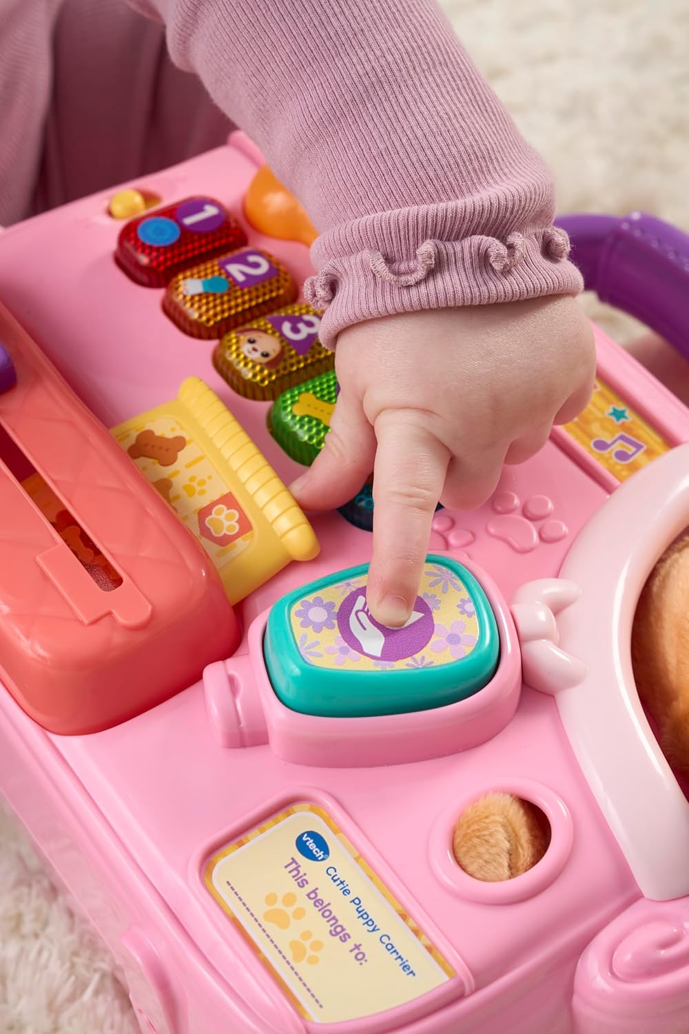 - DISCOVERY: The interactive carrier features a discovery station with chunky light-up buttons that introduce pet care scenarios. Your little one can practise and learn numbers, colours, and shapes while caring for their adorable pretend puppy
